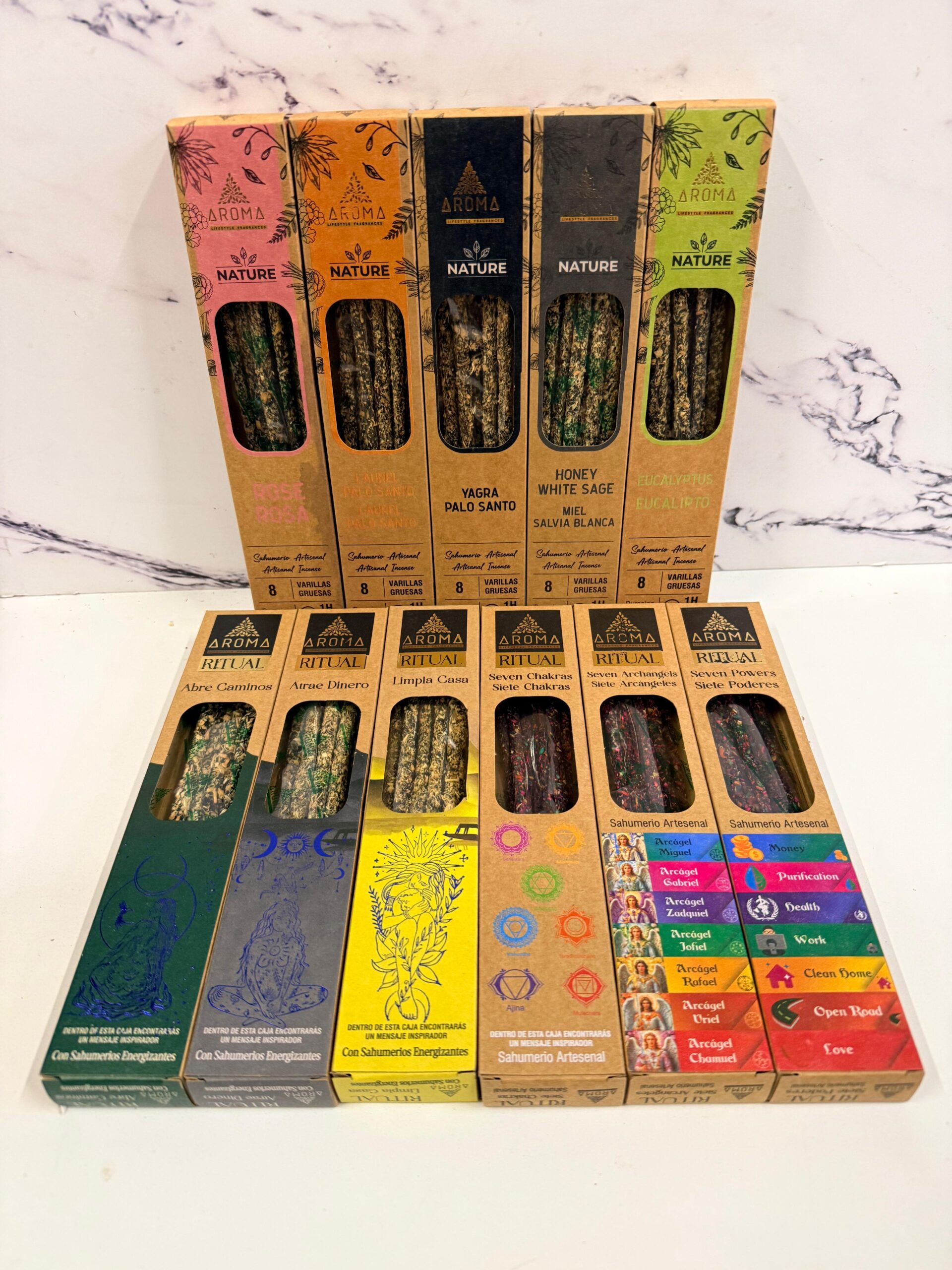 Rosa, Laurel y Palo Santo, Yagra y Palo Santo, Miel y Salvia Blanca, Eucalipto, Abre Camino, Atrae Dinero, Siete Chakras, Siete Arcangeles, Siete Poderes, Limpia Casa