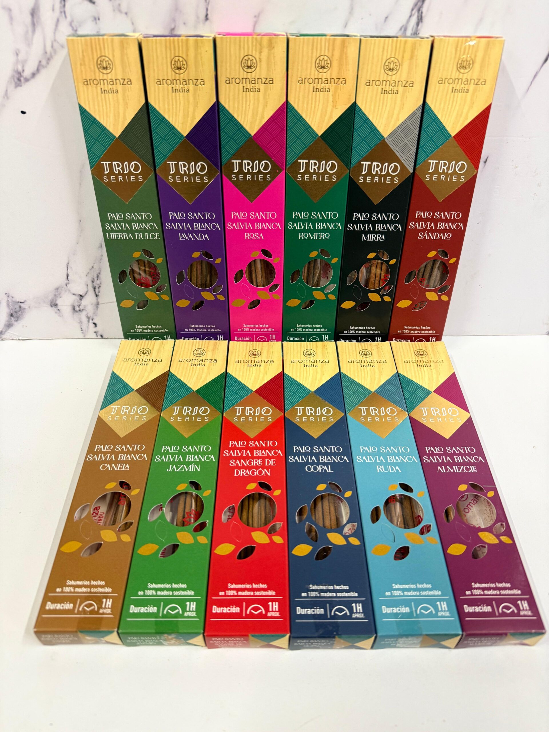 | Aromas | Palo Santo, Salvia Blanca y Jazmin, Palo Santo, Salvia Blanca y Canela, Palo Santo, Salvia Blanca y Mirra, Palo Santo, Salvia Blanca y Sandalo, Palo Santo, Salvia Blanca y Copal, Palo Santo, Salvia Blanca y Almizcle, Palo Santo, Salvia Blanca y Hierba Dulce, Palo Santo, Salvia Blanca y Romero, Palo Santo, Salvia Blanca y Lavanda, Palo Santo, Salvia Blanca y Rosa |